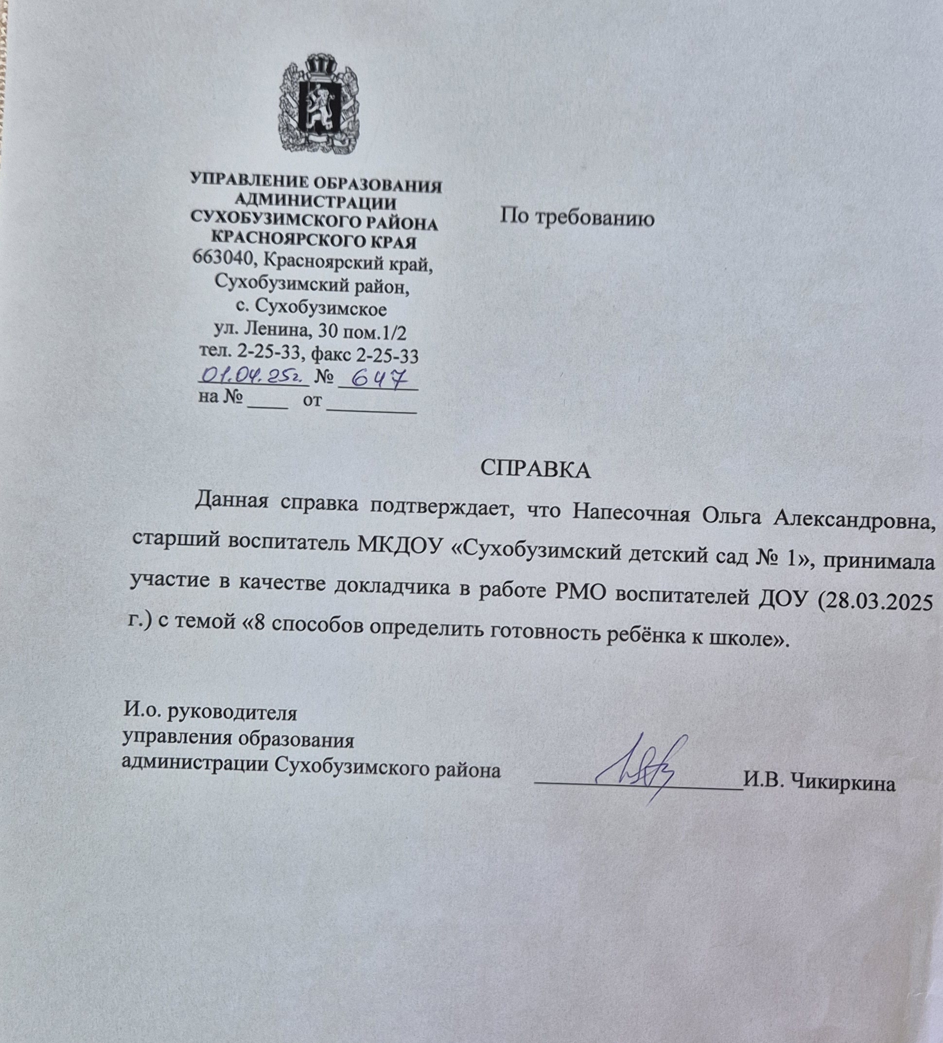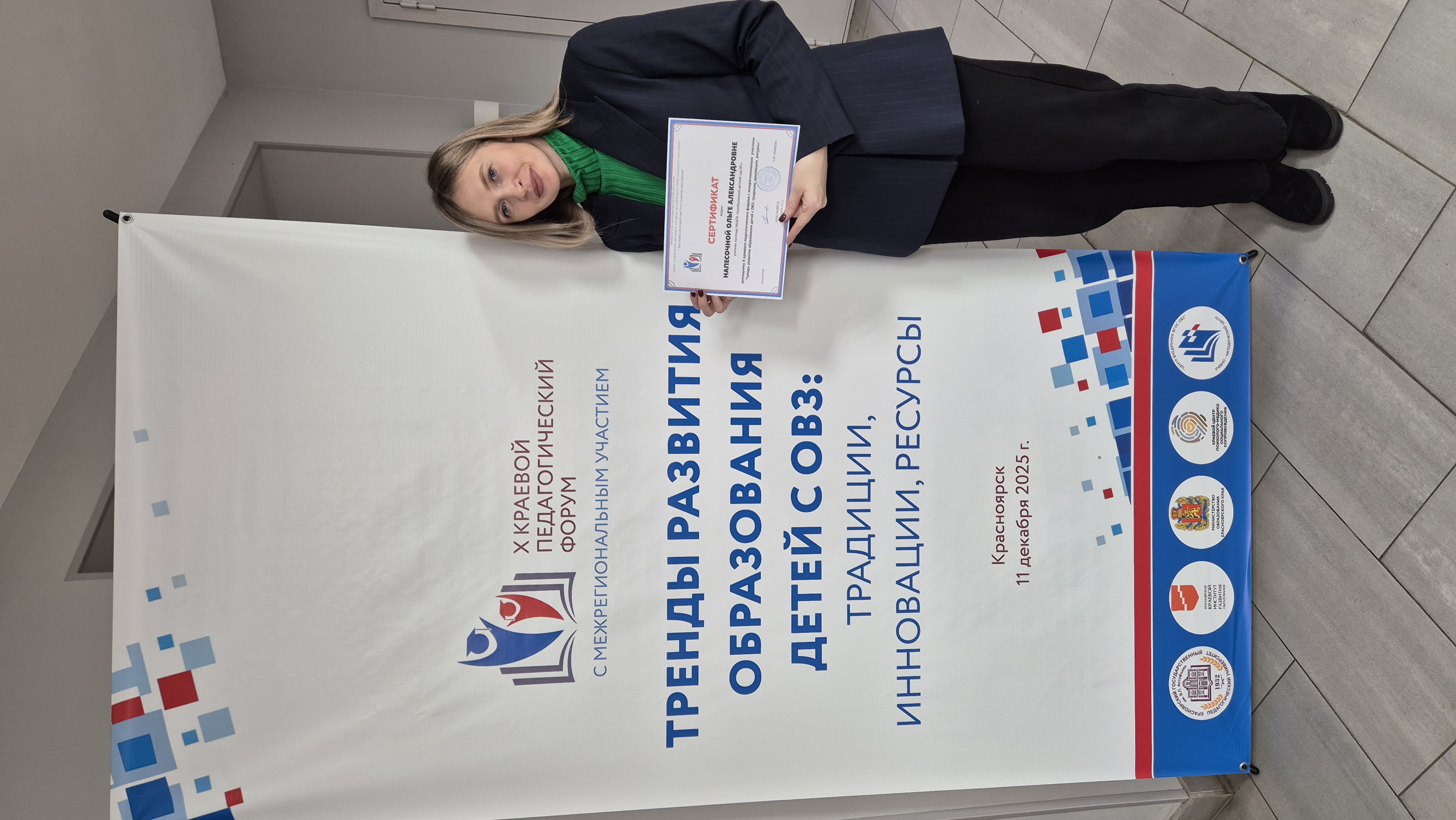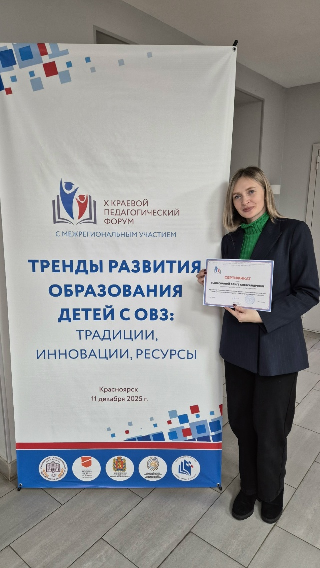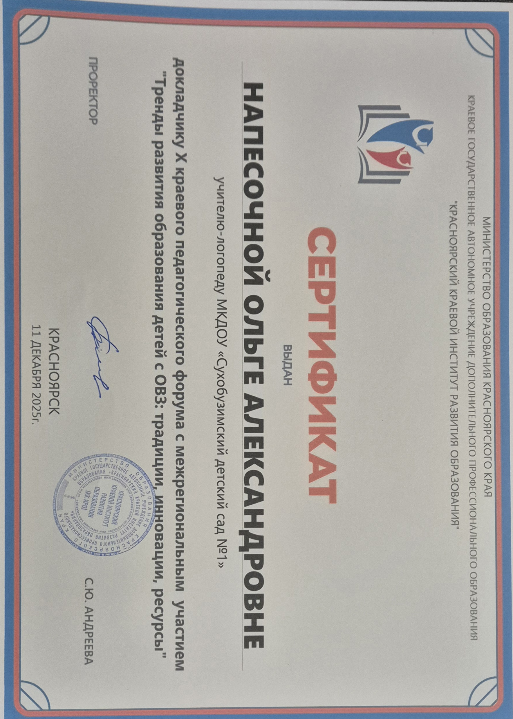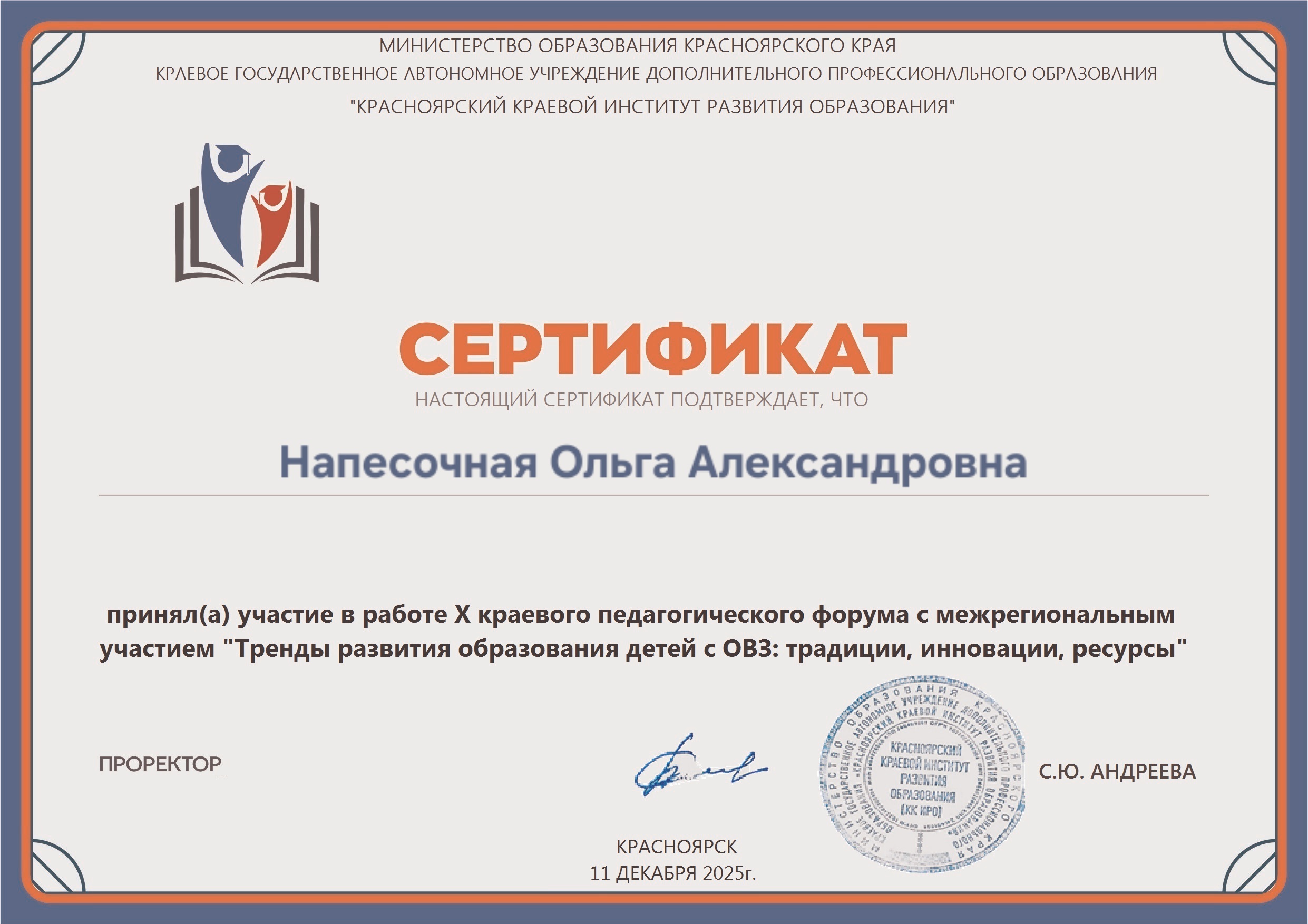 Сертификат докладчику Х краевого педагогического форума с межрегиональным участием Тренды развития образования детей с ОВЗ: традиции, инновации, ресурсы"